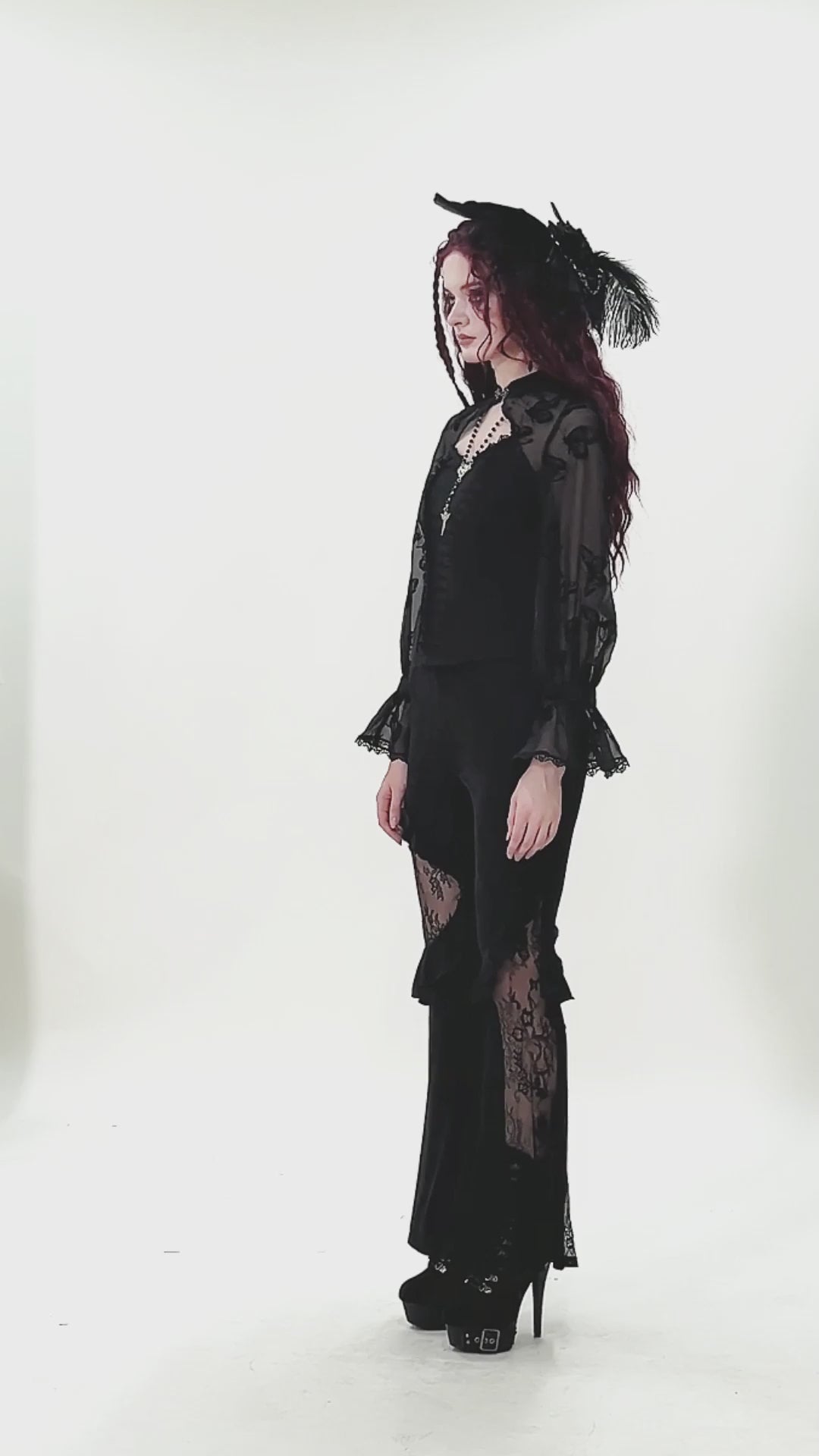 This stunning black lace and velvet top combines Victorian-inspired elegance with modern gothic charm. Featuring delicate butterfly-embroidered sheer sleeves, a ruffled neckline, and a structured corset-like fit, it perfectly embodies the bold, romantic style of gothic fashion. The back features adjustable straps for a tailored fit, making it ideal for evening events, photoshoots, or alternative fashion lovers.