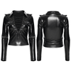 This gothic-inspired long-sleeve top is crafted from shiny, slightly elastic rubberized knit fabric. Its military-style cut combines edgy detailing with a sleek silhouette. The daring V-neckline features a lace-up drawstring design, while the personalized decorative loops on the shoulders add a striking punk statement. Perfect for bold streetwear or alternative fashion looks.