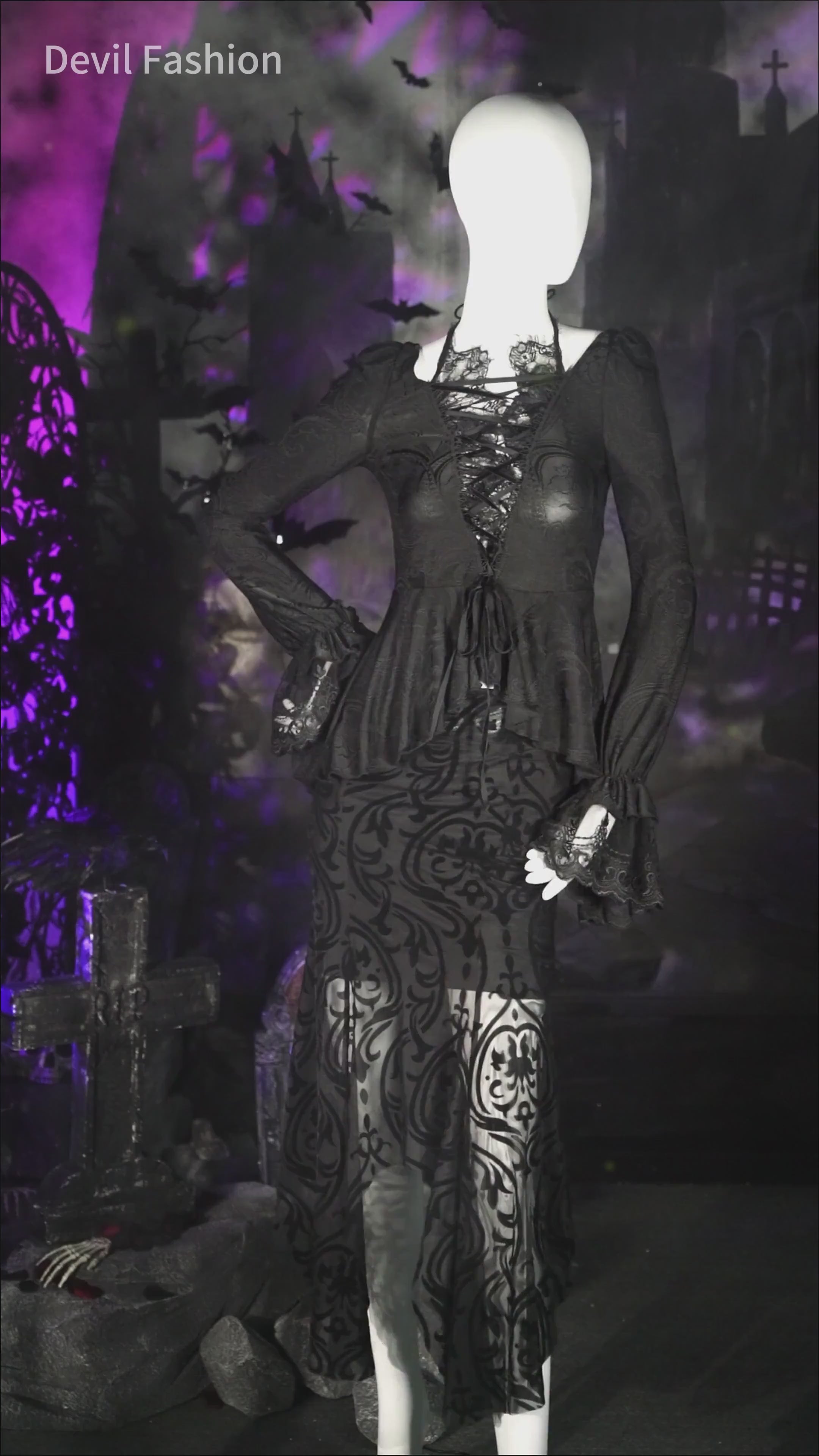 Unleash your inner vixen with this vintage-inspired, sexy black top. Featuring delicate flared lace sleeves and a seductive lace-up front, this irregular top adds a touch of daring to any outfit. Crafted with care and designed to accentuate your curves, this sultry piece combines vintage style with modern allure. Turn heads and command attention in this provocative, must-have garment.