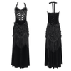 This gothic black velvet dress features a halter neckline, lace-up back, and intricate lace applique on the bodice. The draped jacquard front is adorned with floral accents and long fringe for a dramatic effect. Perfect for gothic events, cosplay, or evening wear, this design blends Victorian elegance with a dark, romantic aesthetic.