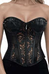 Channel gothic and alternative style with this overbust corset featuring baroque floral scrolls and subtle skulls. Digital printed satin, faux leather trims, mesh panels, stud accents, steel boning, front zip, and back lacing shape a sculpted fit. The black and bronze colorway adds dark romance; style it with skirts, trousers, or clubwear for evening looks. Color variants: black and bronze tones.