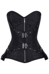 Black steampunk overbust corset for gothic, and alternative fashion stylings. Features steel boning for shaping, front zipper closure, decorative metal clasps, adjustable back lacing, and side pouch accents for a defined silhouette. Ideal for cosplay, themed parties, festivals, stage looks, and dark evening outfits with bold industrial detailing and stage-ready impact.