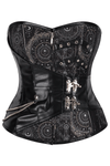 This overbust corset features a celestial astrology print with moons, stars, and clockwork motifs in a dark monochrome palette. Designed with steel boning, front zipper, faux leather panels, rivet accents, and chain detail, it shapes the waist with bold steampunk flair. Ideal for gothic fashion, cosplay, and festivals.