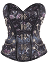 This gothic rose steampunk overbust corset features a dark floral satin print with moonlit accents, silver chains, and ornate clasps. The adjustable back lacing ensures a sculpted fit, while steel boning provides structure and shape. Perfect for gothic fashion, cosplay, or steampunk events, this corset adds dramatic flair to black or purple ensembles.