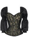Command attention in this gold and black steampunk overbust corset featuring ornate brocade and dramatic puffed sleeves. Inspired by Victorian gothic fashion, it sculpts the waist with structured steel boning and adjustable back lacing. The metal busk front ensures secure closure, while the bold silhouette makes it ideal for cosplay, festivals, themed events, and alternative statement styling.