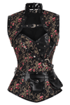 Black steampunk overbust corset with shrug, gold baroque scroll print, and rose motifs for a gothic and alternative fashion look. Features steel boning, side zipper opening, back criss-cross lacing, and a pouch belt with buckle details for statement styling. Ideal for cosplay, themed parties, festivals, and stage wear with skirts, trousers, and layered accessories. Dark romantic statement.