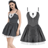 This pinstripe Gothic dress features a heart-shaped neckline framed by ruffled white lace and a central satin bow detail. The flared skirt reveals a lace-trimmed hem, adding a playful yet elegant edge. Adjustable straps and a lace-up corset back ensure a personalized fit. Ideal for gothic, vintage or alternative fashion looks with a romantic twist.