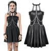 This gothic-inspired leather dress features intricate chain detailing across the chest and waist, with a flattering flared skirt. The halter neck design with ruffled edges adds a touch of dramatic flair, while the zipper back provides a sleek and fitted silhouette. Perfect for those who want to make a bold statement with their dark and edgy style.