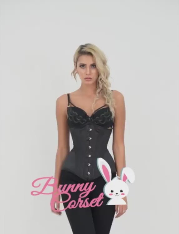 Enhance your curves with this gothic waist training corset, structured for dramatic waist definition. Featuring 14 spiral steel bones and 2 flat steel bones for firm shaping, it includes a front metal busk and 6.5-meter-long lacing for a secure fit. The sleek black design embodies elegance and alternative fashion, perfect for achieving a striking hourglass silhouette with a touch of gothic allure.