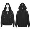 Crafted from a blend of sweatshirt and leather-like fabrics, this black hoodie channels a bold gothic punk vibe. The skull toggles and thick wax ropes on the shoulders add an avant-garde edge, while metal eyelet drawstrings amplify its striking silhouette. Featuring a hooded design and relaxed fit, it’s the perfect mix of rebellion and streetwear style for everyday statement looks.