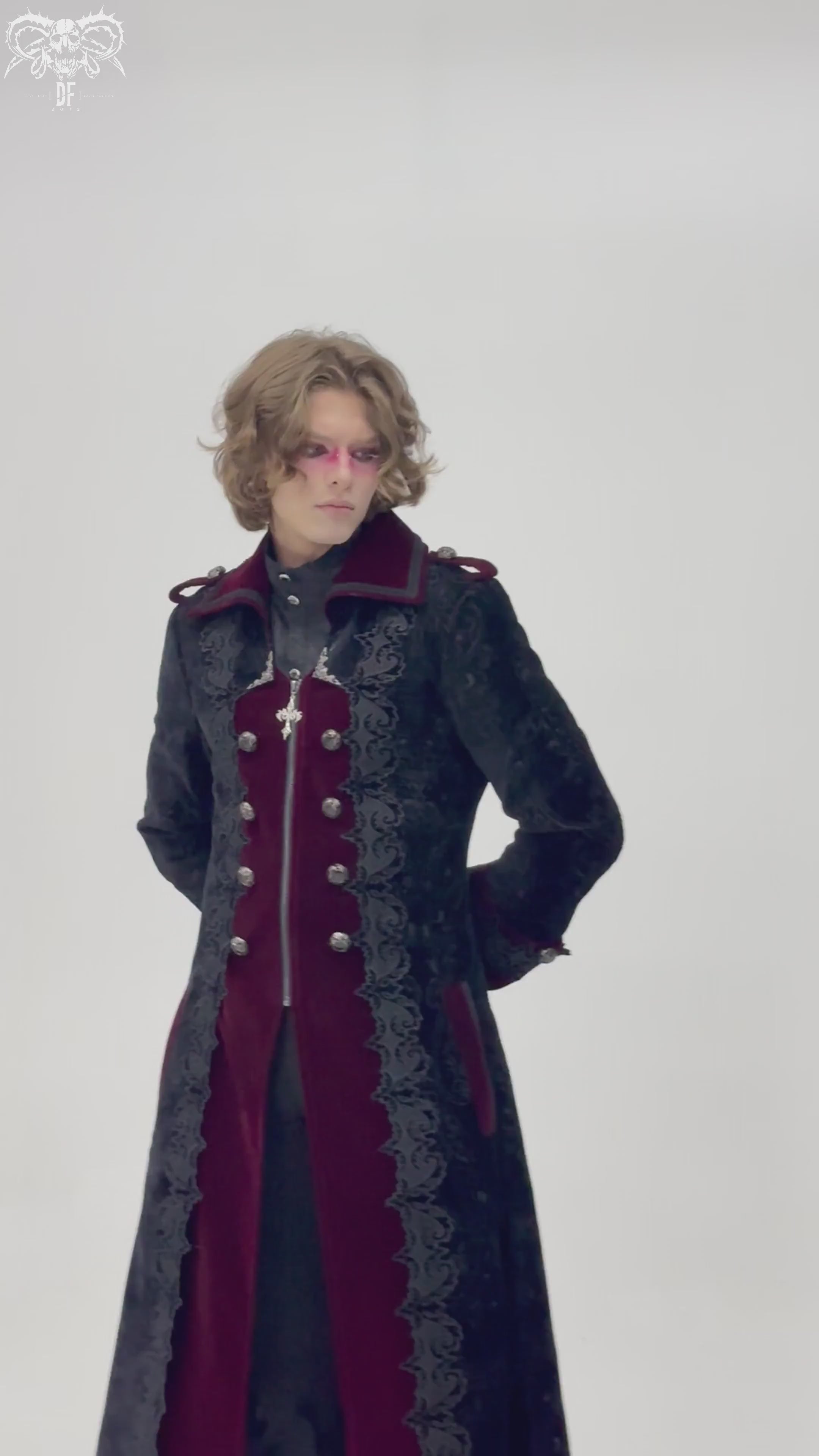 Erweitern Sie Ihre gotische Garderobe mit diesem dramatischen langen Samtmantel, der mit tiefweinroten Akzenten, kunstvollen Brokatdetails und einer königlichen Silhouette beeindruckt. Die silberfarbenen Knöpfe und Epauletten verleihen einen aristokratischen Touch, während der geteilte Saum und die strukturierte Passform viktorianische und von Vampiren inspirierte Eleganz hervorrufen. Ein atemberaubendes Stück für gotische Mode, Cosplay oder dunkle Abendgarderobe.