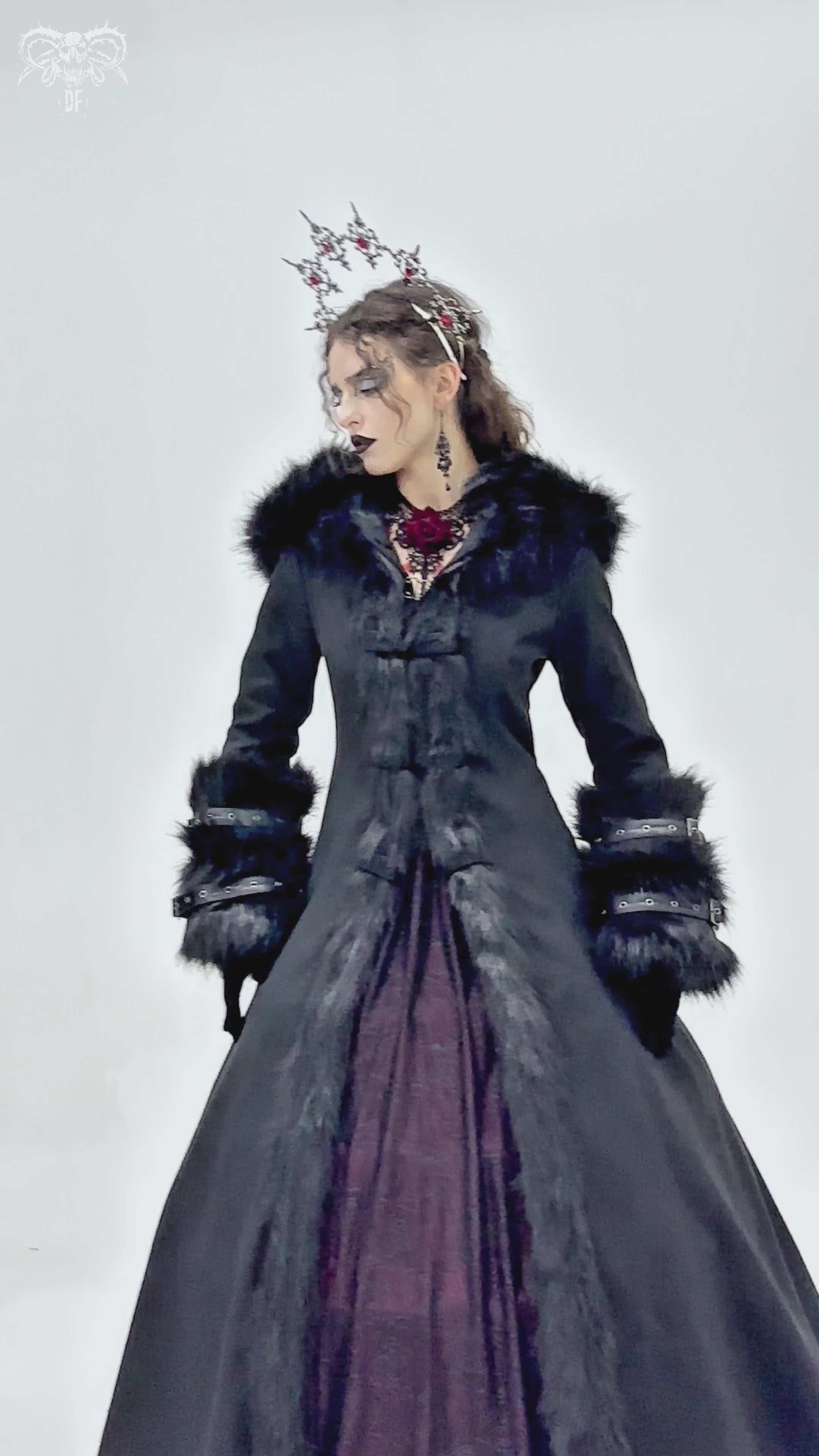 An diesem eleganten Modell eines Damenmantels im Gothic-Stil werden Sie nicht vorbeikommen. Dieser lange schwarze Mantel hat ein Vintage-Design, das Ihnen auf jeden Fall gefallen wird, und verfügt außerdem über Pelzeinsätze, die Sie bei kaltem Wetter warm halten. Mit diesem schwarzen Mantel können Sie viele Gothic-Vintage-Outfits kreieren und luxuriös aussehen.