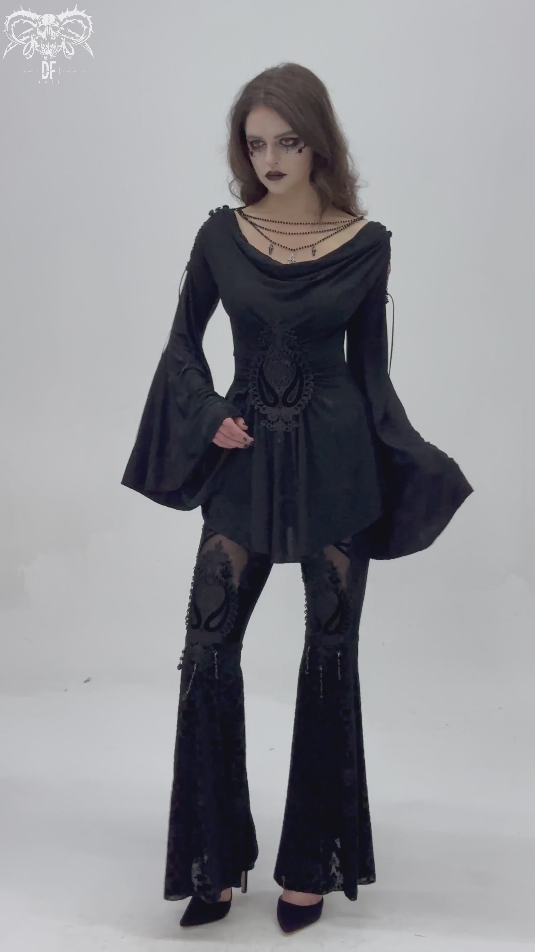 • Auffällige Spitzendetails: Bringen Sie Ihren inneren Goth zum Ausdruck mit einer schwarzen Tunika mit aufwendigen Spitzendetails am Ausschnitt, an den Ärmeln oder am Saum.Kombinieren Sie es mit einer Statement-Halskette, Leggings und Plateaustiefeln für ein dunkelromantisches Ensemble.