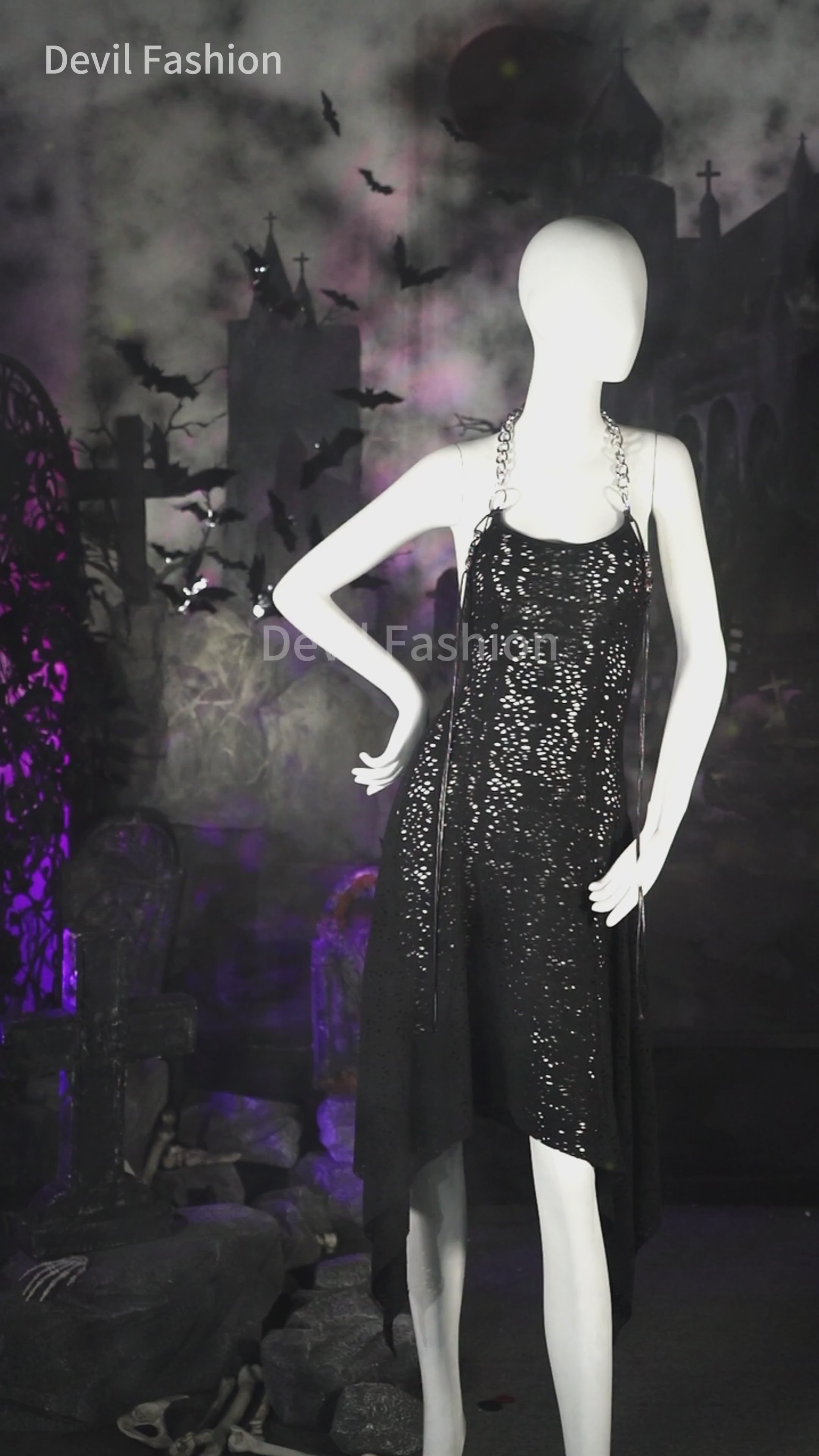 Zeigen Sie Ihre mutige Seite mit unserem unregelmäßigen Gothic-Kleid für Damen. Dieses sexy Tuch verkörpert den Gothic-Stil mit einem asymmetrischen, zerrissenen Design und markanten Kettendetails. Sein gewagtes Design mit nacktem Rücken unterstreicht Ihren Reiz, während der vielseitige schwarze Farbton für einen kantigen und dennoch raffinierten Look sorgt. Eine unverzichtbare Ergänzung für jede alternative Modekollektion.