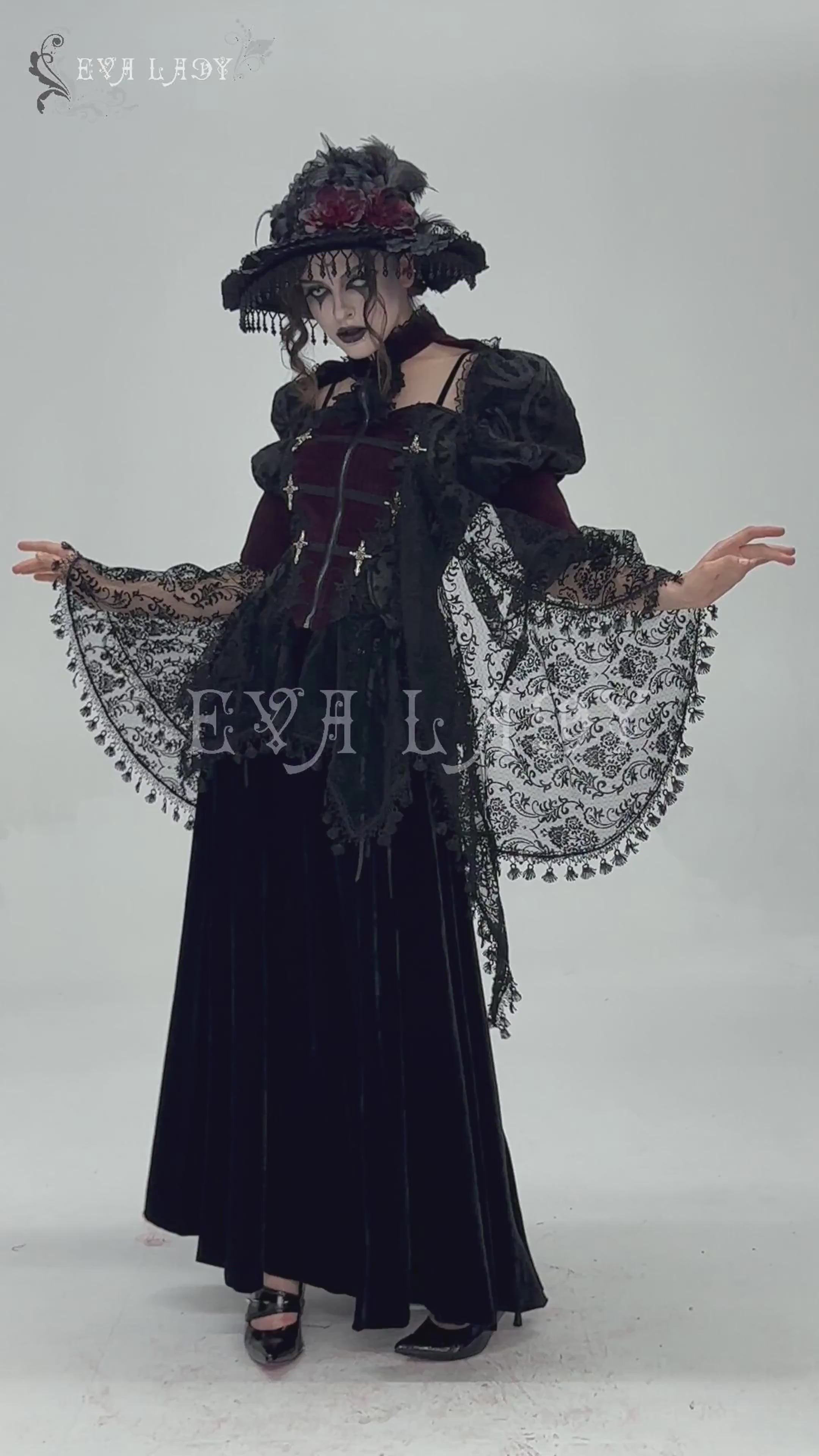Dieses viktorianisch inspirierte Gothic-Korsettoberteil verbindet luxuriöse Spitze mit Steampunk-Flair. Das Design zeichnet sich durch dramatische Glockenärmel, Puffschultern und elegante florale Spitzenakzente aus. Ein Frontreißverschluss und eine verstellbare Schnürung hinten sorgen für eine perfekte Passform. Diese Bluse ist ideal für Cosplay, Gothic-Mode oder besondere Anlässe und verleiht mit ihrem asymmetrischen Saum und den aufwendigen Details ein aristokratisches Flair.