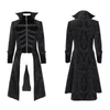 Dieser gotische Herrenfrack verbindet viktorianisches Drama mit modernem Flair. Aus kunstvollem schwarzem Brokat gefertigt, verfügt er über Samtpaneele, dekorative Borten und Metallknöpfe für einen auffälligen, militärisch inspirierten Look. Der dramatische hohe Kragen und der lange ausgestellte Saum schaffen eine kühne Silhouette, die perfekt für die gotische Mode oder Bühnenauftritte ist.