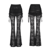 Diese gothischen Schlaghosen aus floraler Spitze haben ein Fake-Zweiteiler-Design, das eine geschichtete Silhouette mit dramatischer Bewegung erzeugt. Verstellbare Tunnelraffungen formen und betonen die Kurven, während Spitzenkordeln an beiden Seiten einen romantischen Abschluss hinzufügen. Die transparenten Spitzenbeine weiten sich am Saum für einen dunklen, femininen Look, der perfekt zu Korsetts, Netzoberteilen und Plateaustiefeln in Abendlooks passt.