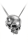 Das harte, merkmallose Gefäß der Seele, befreit von seiner sterblichen Eitelkeit. Dieses auffällige Schädelanhänger zeigt einen kieferlosen menschlichen Schädel, komplett mit einem vampirischen Eckzahn. Eine temporale Perforation verläuft durch den Schädel, durch die die 21" Panzerkette führt. Aus robustem Zinn gefertigt, bietet es einen markanten, gotischen Look für jedes Outfit.