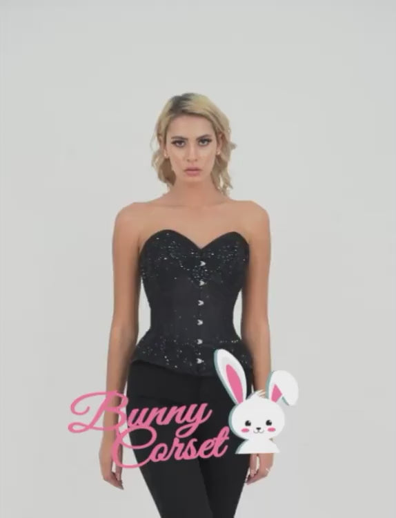 Das Carita Black Overbust-Korsett ist ein auffälliges, taillenbetonendes Stück, das für die Gothic- und Couture-Mode entworfen wurde. Gefertigt mit 8 spiralförmigen Stahlstäben und 4 flachen Stahlstäben, bietet es eine feste Formgebung und Struktur. Der Metallbusk-Verschluss vorne, das mit Baumwolle gefütterte Schamstück und die lange Rückenschnürung sorgen für einen sicheren Sitz. Ideal für Größen von 5'3" bis 5'10", ist dieses elegante schwarze Korsett perfekt für elegante Abendgarderobe und alternative Mode.
