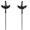 Schwarzer gotischer Ritualstab, gestaltet mit Rabenflügeln, einem zentralen Kreuzmotiv, geschichteten Perlenvorhängen und skulptierten Rosenakzenten. Gefiederte Details, hängende Ketten und verzierte Verzierungen schaffen eine dramatische Silhouette für gotische Stylings, dunkle Fantasiekostüme, Bühnenlooks und zeremonielle Darstellungen. Ein auffälliges Statement-Requisit für alternative Modeeditorials, Kunstveranstaltungen, Theaterszenen und Fotosets.