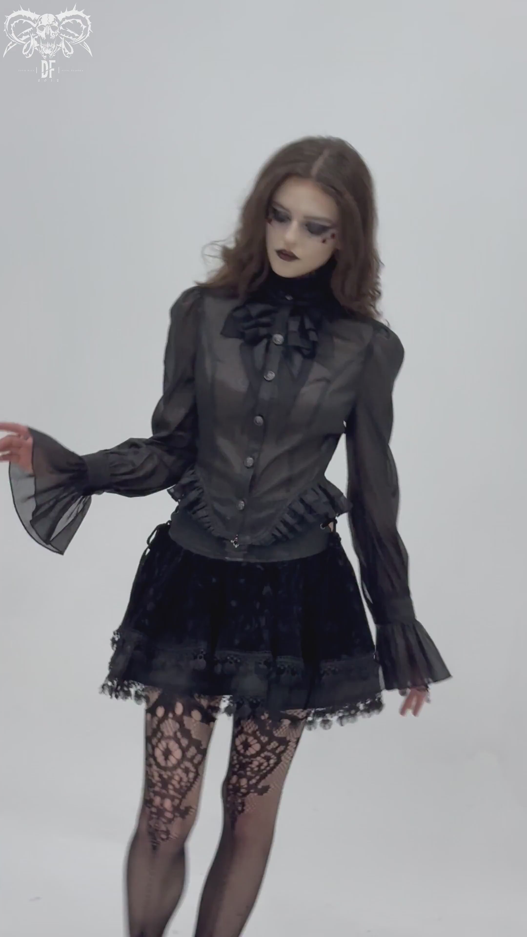 This gothic high-waist velvet skirt features a vintage-inspired corset-style waistband with delicate lace-up details for an adjustable fit. The embroidered cross detail adds a bold statement, while the intricate lace trim and tassel hem enhance the Victorian aesthetic. Crafted from polyester and polyamide, this flared skirt is perfect for gothic, steampunk, and alternative fashion styles.