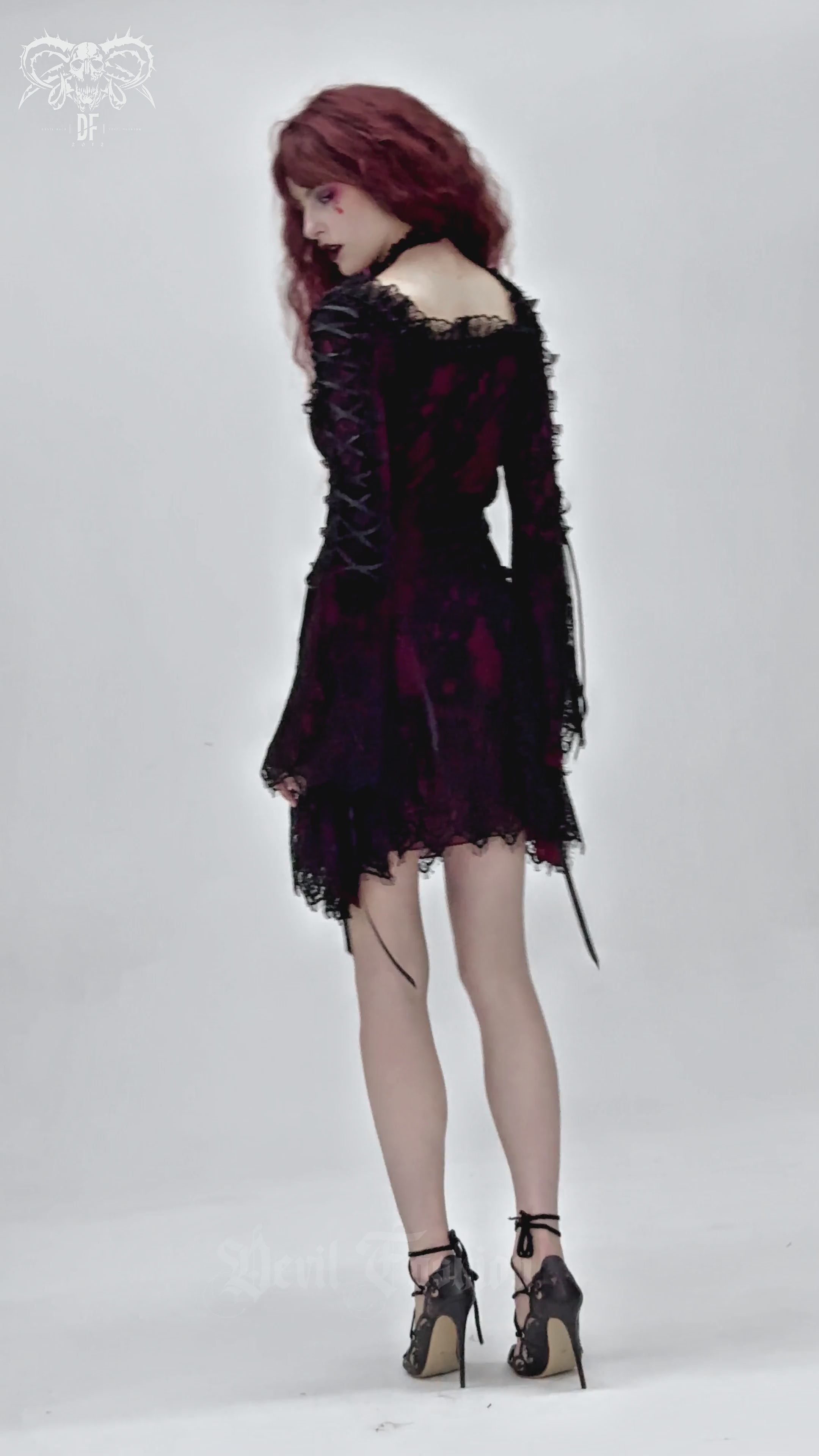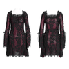 This gothic lace mini dress blends sheer black floral lace over deep red fabric, creating a dark, romantic silhouette. Featuring flared sleeves, lace-up details, and a fitted square neckline, it captures a Victorian-inspired gothic style. Perfect for gothic fashion, parties, or alternative events, this dress is a striking choice for anyone embracing dramatic elegance.