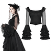 This Gothic-inspired black top features delicate lace detailing and sheer mesh sleeves, giving it a romantic, edgy look. The bell sleeves are adorned with ruffled lace, adding volume and flair to the design. Perfect for alternative fashion lovers, this top pairs well with skirts or pants for a versatile yet striking outfit. Ideal for evening outings, events, or everyday wear.