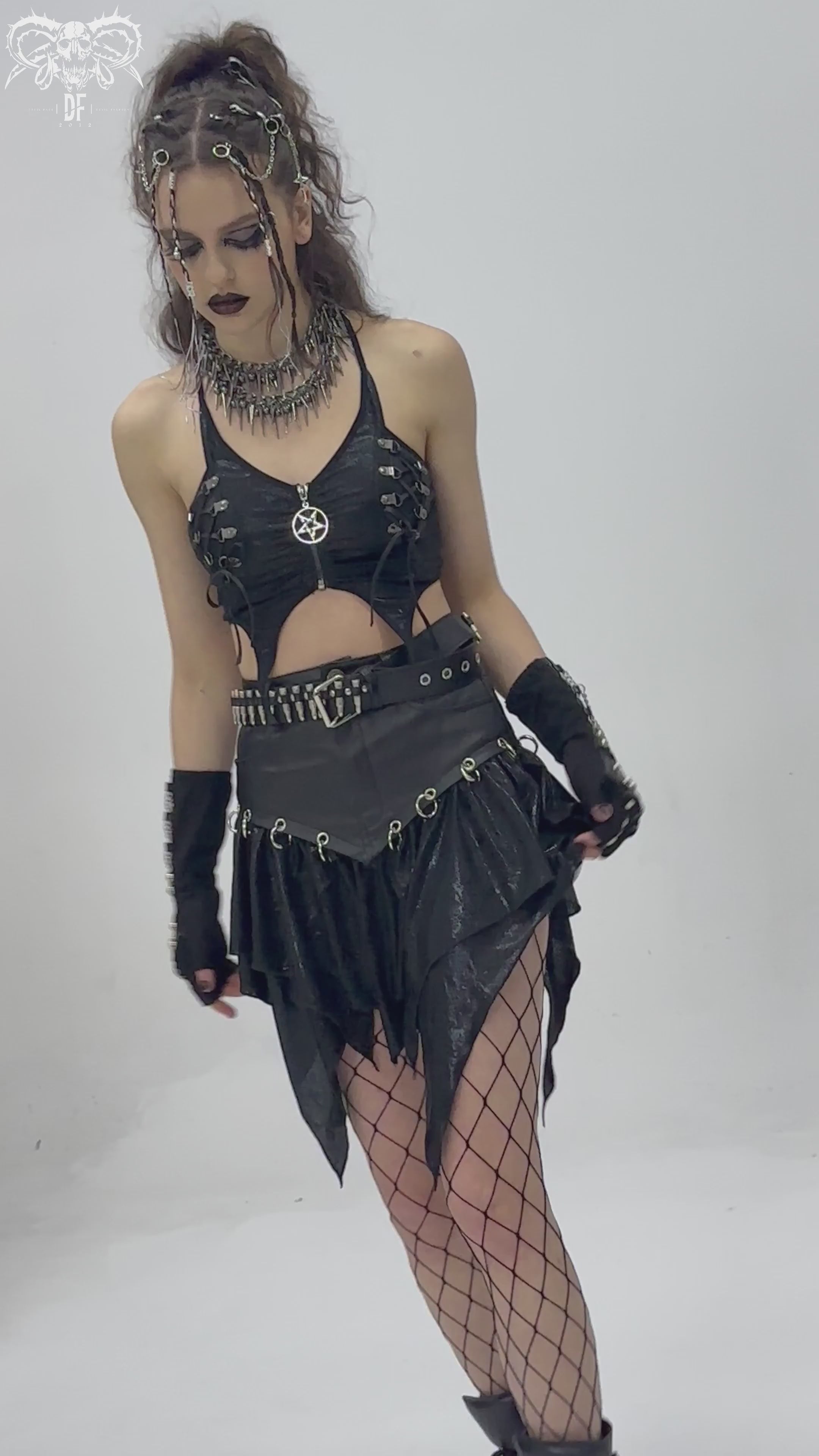 Embrace rebellious style with this mini skirt. Featuring an irregular, asymmetric hemline, snake print panels, and metal ring details, this high-waisted skirt adds a punk edge to any look. Perfect for alternative fashion enthusiasts seeking a bold statement piece.