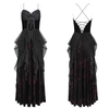 This elegant Gothic-inspired dress features a stunning lace-up back, delicate ruffled tulle layers, and a rich, dark hue. Perfect for a Victorian or alternative style, it combines both a flattering silhouette and dramatic detail. The dress is ideal for formal events, themed parties, or any occasion that calls for dark, romantic fashion with a twist.