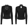 Made of super elastic, soft knitted fabric and lace. The swinging collar design adds a unique sense of style, providing just the right touch of sexiness. Exquisite shoulder decals enrich the visual details, while the delicate rose buckle at the back collar adds a romantic Gothic vibe. Perfect for layering with skirts or pants, this top brings a bold statement to any alternative wardrobe.