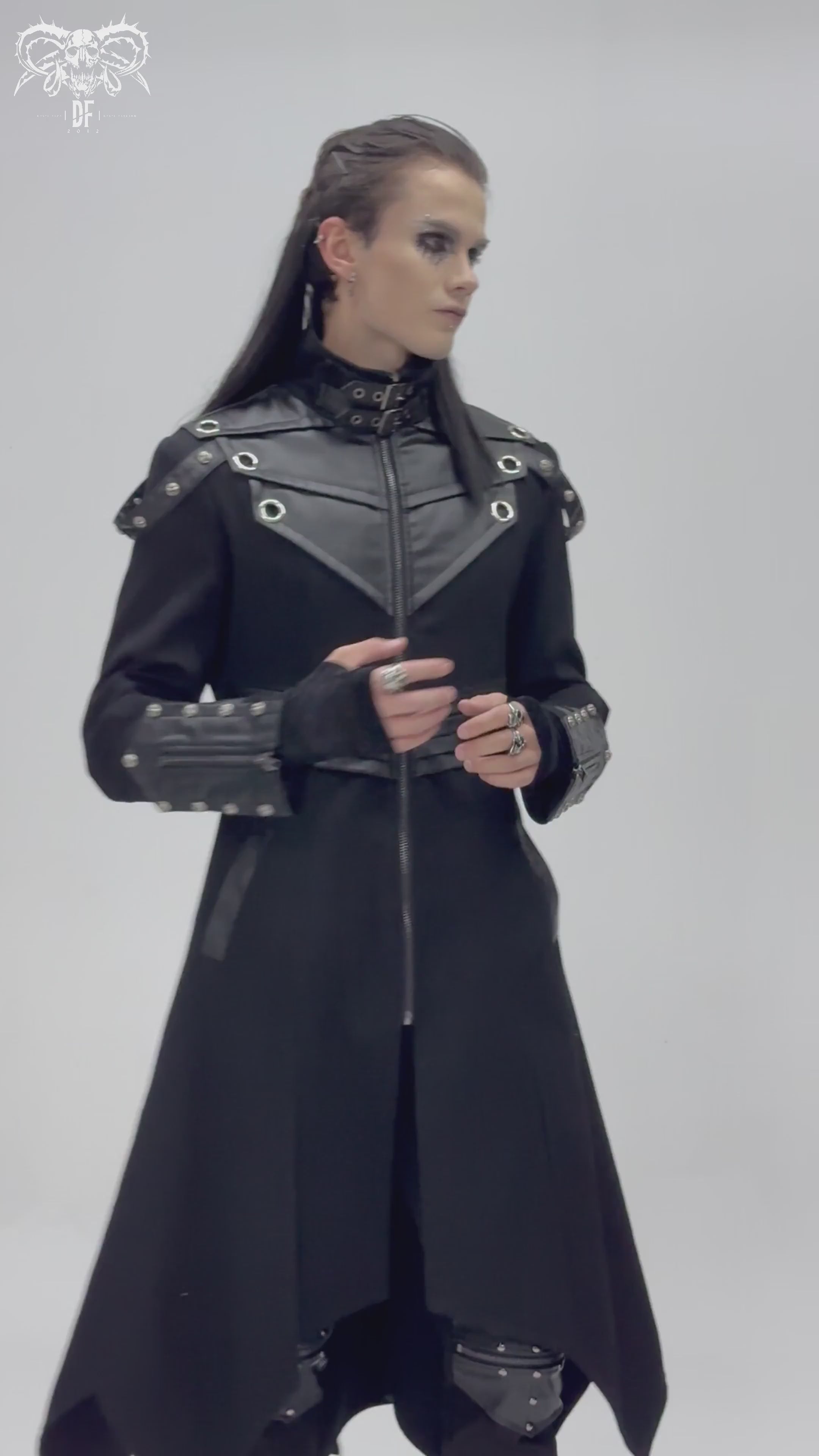 Este abrigo gótico redefine la moda audaz con sus paneles de cuero sintético, intrincados herrajes metálicos y dobladillo asimétrico. Hecho con una mezcla de algodón, cuero sintético y spandex, ofrece un ajuste estructurado ideal para cosplay, festivales o ropa de calle gótica diaria. El cuello alto, los remaches decorativos y el cierre de cremallera añaden un atractivo funcional y estético, convirtiéndolo en una pieza destacada del guardarropa.