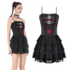Sirve romance oscuro con este vestido mini gótico con volantes de encaje en capas y un ajuste inspirado en corsé. El panel de encaje rojo añade un contraste perverso, terminado con correas de hebilla sobre el busto para un toque punk. Las tiras de espagueti ajustables y el ribete de encaje enmarcan el escote, mientras que el cordón de corsé en la espalda te permite afinar la silueta. Perfecto para noches de club, conciertos, citas alternativas o estilismo de cosplay. ¡Combínalo con medias de red y plataformas para un look impresionante!