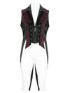 Este chaleco gótico para hombre presenta un patrón de brocado de rosas rojas intensas, detalles de botones en cruz y una silueta de frac dramática. El diseño sin mangas está estructurado con un cuello afilado, hombros con cordones y paneles negros texturizados. Hecho de una mezcla de poliéster y spandex para un ajuste estructurado. Ideal para looks inspirados en aristócratas oscuros, steampunk o vampiros.