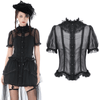 Esta blusa gótica transparente es imprescindible para cualquier guardarropa alternativo. Con mangas abullonadas con ribetes de encaje, un dobladillo con volantes y un intrincado detalle de encaje en la parte delantera, esta blusa emana romance oscuro. El cierre de botones añade un toque de estilo vintage, mientras que la tela transparente crea un efecto dramático y etéreo. Perfecta para los amantes de la moda gótica, victoriana y alternativa.