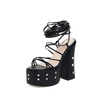 ¡Añade un toque romano a tu colección de zapatos! Estas sandalias con cordones, tacones altos y plataformas decoradas con remaches se verán magníficas con varios conjuntos alternativos, así como con atuendos de moda para fiestas.