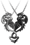 Un símbolo de conexión eterna, el Colgante Draconic Tryst presenta dos dragones de peltre entrelazados, uno negro y otro de peltre plateado envejecido. Los dragones, posicionados para formar un corazón, están unidos por imanes ocultos, pero se pueden separar para formar dos colgantes individuales. Cada colgante se lleva en su propia cadena de 18", una negra y la otra plateada. Úsalos unidos o como símbolos separados de unidad.