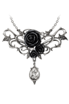 Un símbolo decadente de romance y indulgencia oculta, este collar presenta un marco de filigrana en tono plateado adornado con rosas de resina negra gótica. Con un llamativo cristal transparente cortado en forma de lágrima, el colgante evoca tanto elegancia como tentación. Un tributo a los placeres sensuales y las pasiones empapadas de vino, esta pieza cuelga delicadamente de una cadena de plata, capturando un oscuro atractivo en cada curva.
