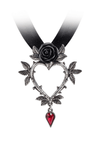 Declara tu amor oscuro con el collar Guirlande d'Amour. Este colgante gótico en forma de corazón presenta enredaderas de rosas de peltre adornadas con una rosa de resina negra y una impresionante gota de cristal austríaco rojo. Úsalo como gargantilla o collar, haciendo una declaración de día o de noche. Hecho a mano en Inglaterra, esta pieza viene en una bolsa de la marca Alchemy, lista para evocar pasión y misterio.