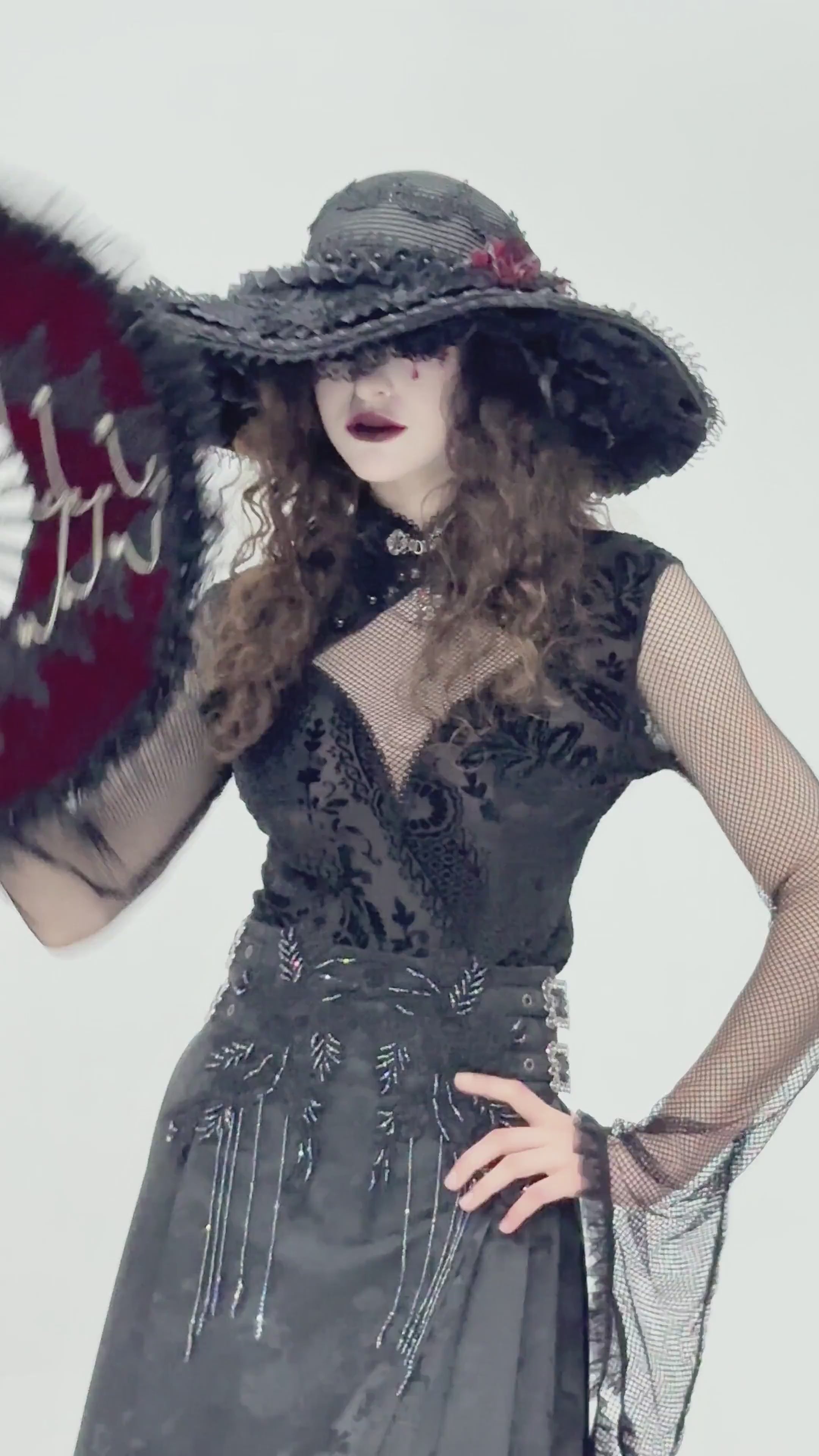 Este top gótico está adornado con intrincados patrones de encaje y espectaculares mangas acampanadas de malla, creando una apariencia oscura y elegante. El cuello alto y el diseño recortado le dan un toque moderno a la moda victoriana, lo que lo hace perfecto para eventos góticos o ropa alternativa diaria. Los detalles de malla y los delicados detalles de encaje se combinan a la perfección, ofreciendo una pieza destacada para realzar tu guardarropa gótico con un estilo sofisticado.