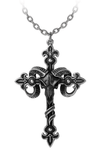 Abraza el simbolismo oscuro con este collar de cruz gótica, que presenta una cruz de flor de lis ornamentada atravesada por un detallado cráneo de carnero. Inspirado en la resistencia templaria y temas ocultos, este colgante añade una declaración audaz a cualquier look gótico o alternativo. Fabricado en peltre envejecido con motivos de cuernos enrollados y pergaminos para un drama extra.