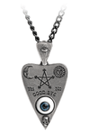 Despierta intriga con este colgante de plancheta inspirado en lo oculto, grabado con un pentagrama, símbolos lunares y solares, y la palabra "GOODBYE". Presenta un ojo sintético que mira fijamente y un acento de calavera, el reverso incluye un alfabeto completo de tablero de espíritus. Una reliquia de sesión del siglo XIX renacida en peltre para canalizar energía del más allá—ICU lo ve todo.