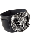 Invoca el espíritu del antiguo ritual con esta amplia correa de muñeca de cuero negro, que presenta un detallado cráneo de carnero de peltre con un pentagrama. Inspirado en el simbolismo místico de Aleister Crowley, este brazalete gótico añade un toque oculto a tu moda oscura. La hebilla ajustable asegura un ajuste seguro para el ritual o la rebelión.