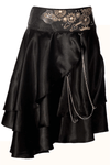 Esta falda negra steampunk con capas combina la moda gótica y victoriana con un dobladillo asimétrico alto-bajo y paneles en cascada. Una cinturilla bordada y acentos de cadena colgante crean un detalle industrial audaz, mientras que la silueta fluida añade un movimiento dramático. Ideal para cosplay, festivales, actuaciones en el escenario y estilismo alternativo en tonos negros profundos para looks impactantes.