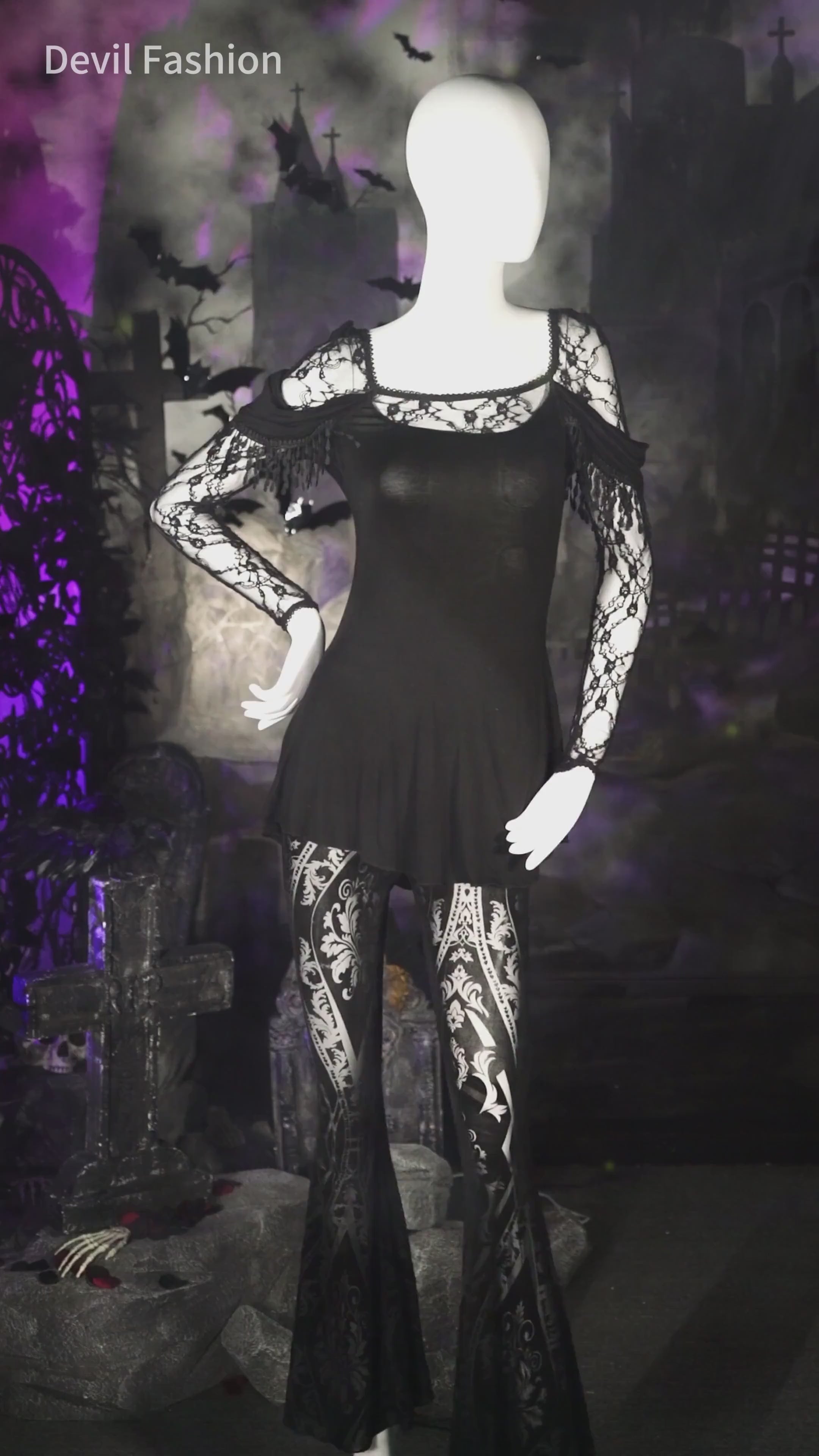 Echa un vistazo a nuestro modelo de moda de pantalones negros de mujer de estilo gótico. Estos pantalones negros tienen un corte acampanado que resaltará al máximo tu figura, y además tienen un estampado estiloso que no te dejará indiferente. Así que elige tu talla y pide estos pantalones de campana negros para tu guardarropa.