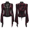 Ce haut en dentelle gothique est confectionné en velours et dentelle tie-dye, mêlant romance sombre et charme victorien. La dentelle à l'avant ajoute une touche de sensualité, tandis que la bordure en dentelle gothique et les rivets en pierres précieuses enrichissent le design. Un col haut et des panneaux latéraux plissés ajoutent des détails complexes, avec des manches évasées fluides complétant la silhouette dramatique.