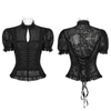 Cette blouse gothique noire est confectionnée en chiffon brodé avec un motif complexe de fleurs de cajou. Le tissu transparent et doux dégage une ambiance mystérieuse et romantique. Les manches bouffantes et la taille cintrée mettent parfaitement en valeur votre silhouette. Le panneau avant de la poitrine présente une superbe combinaison de dentelle, ajoutant une touche gothique élégante. Idéale pour des tenues alternatives inspirées de l'époque victorienne.