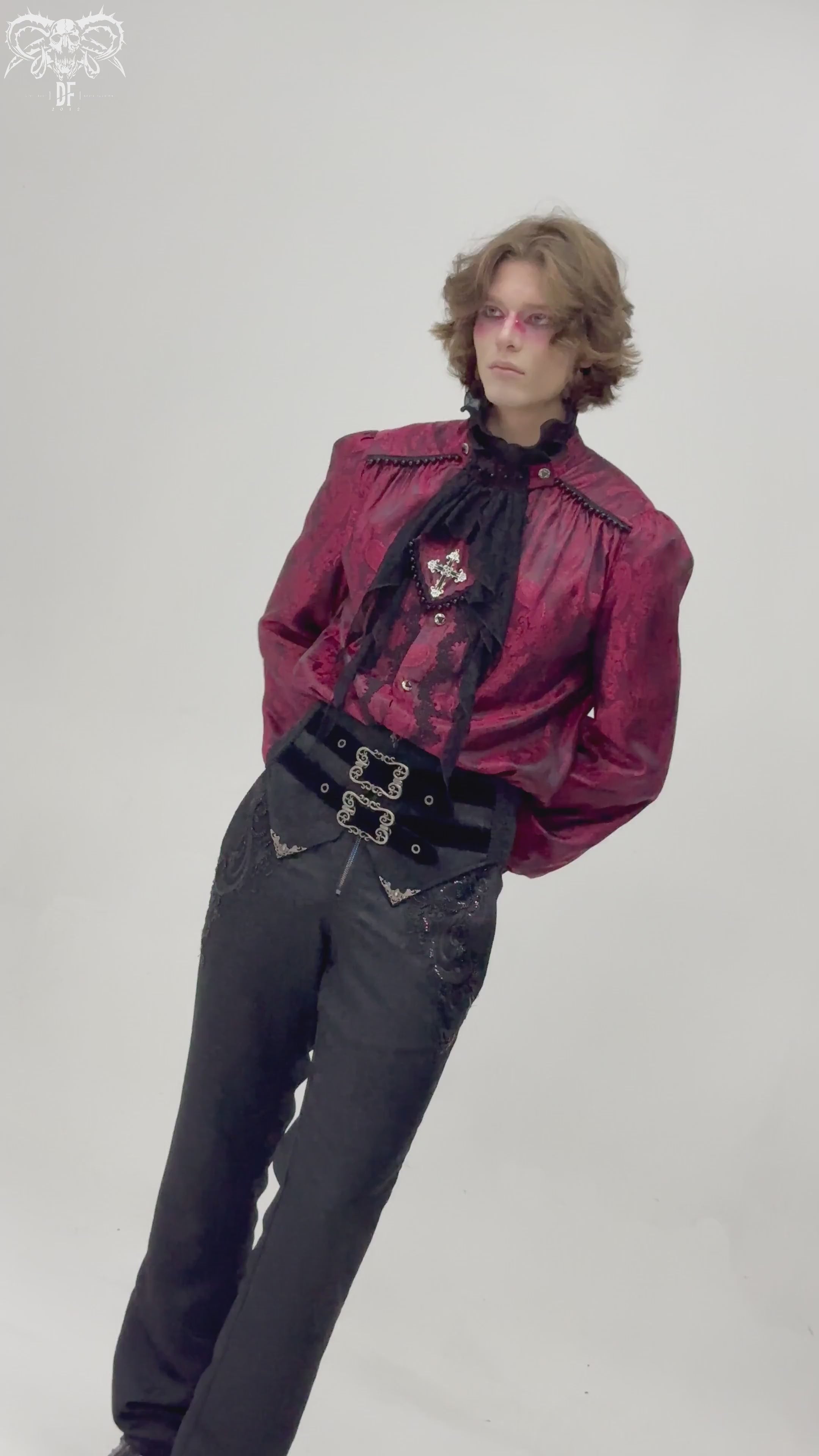Cette chemise gothique victorienne est fabriquée en polyester jacquard lustré avec une silhouette ajustée. Les caractéristiques incluent un col montant à volants, des poignets en dentelle dramatiques et un jabot amovible avec une broche en croix. Les manches bouffantes et la garniture en dentelle à l'avant amplifient son esthétique romantique de vampire—parfaite pour les événements gothiques, le cosplay ou les tenues formelles sombres.