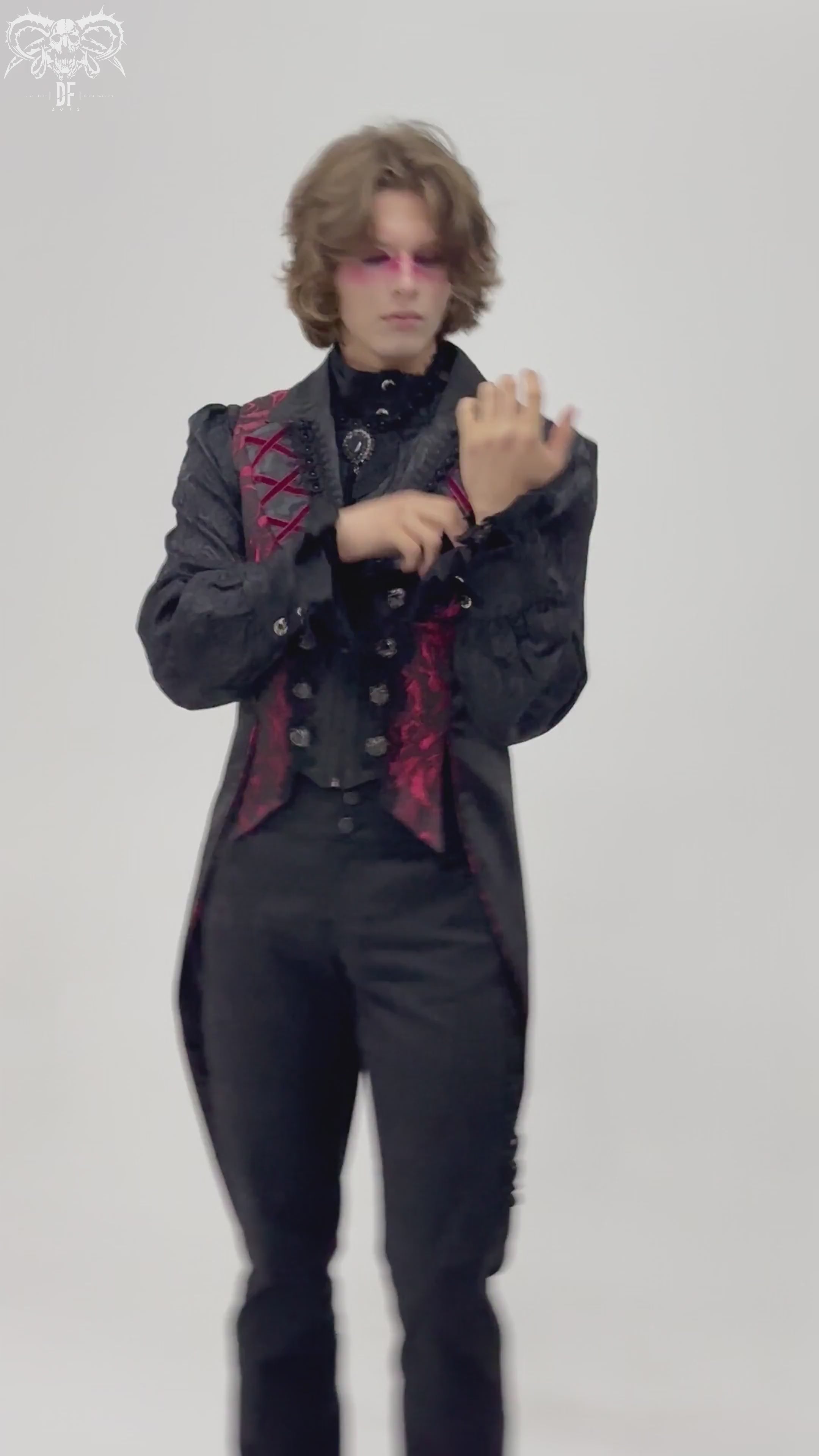 Ce gilet gothique pour homme présente un motif de brocart de roses rouges profondes, des détails de boutons en croix et une silhouette de queue-de-pie dramatique. Le design sans manches est structuré avec un col pointu, des épaules lacées et des panneaux noirs texturés. Fabriqué à partir d'un mélange de polyester et de spandex pour une coupe structurée. Idéal pour des looks inspirés de l'aristocratie sombre, du steampunk ou des vampires.