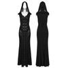 Cette robe gothique à capuche est confectionnée en maille élastique et en résille pour une silhouette audacieuse. Le panneau en résille à l'avant ajoute une touche sensuelle, tandis que les anneaux métalliques et la segmentation en sangle amplifient l'esthétique punk. Un laçage à l'arrière avec un détail en anneau en D métallique façonne la coupe. Audacieuse, structurée, et faite pour dominer chaque ombre et projecteur.