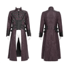 Ce long manteau gothique mélange des éléments punk et un tissu violet texturé pour une silhouette saisissante. Les panneaux structurés et les sangles superposées ajoutent du caractère, tandis que le polyester inélastique maintient une forme nette. Des accents métalliques détaillés, un laçage aux poignets et une fermeture éclair avant audacieuse créent un look dramatique idéal pour les événements gothiques et l'expression personnelle.